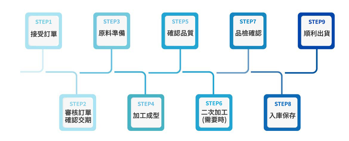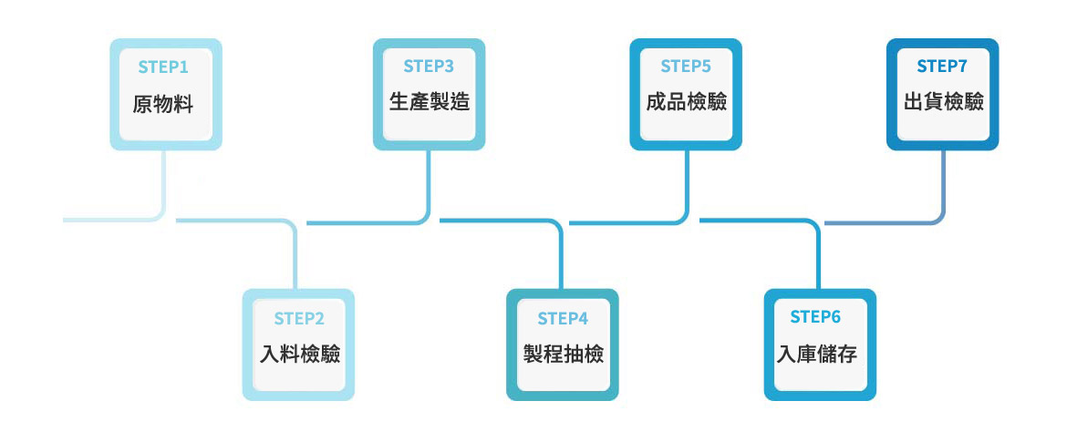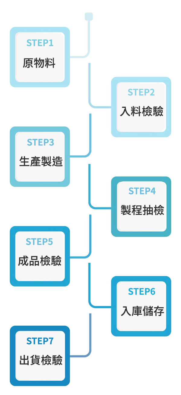 本公司對於研發及生產技術有相當多年經驗,針對每項產品做研發與改良,並提高生產效率。製造過程中從原料檢驗到製成品,每道製程關卡均通過我們嚴格的品管考驗。在生產過程中現場品管定時對生產線的產品做抽檢,使產品的品質隨時維持在最佳狀態。生產線人員亦須針對所有生產的機械做100%的全面篩選,再一次經選別品管抽檢,對品質做到全面監控。