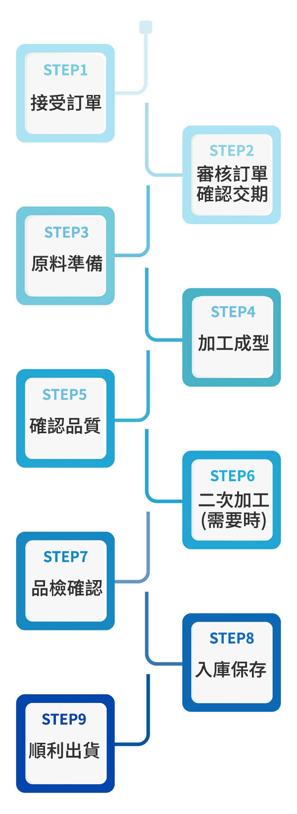 為了給予客戶更好的品質,並將管理制度化、生產秩序化、品質監控嚴格化且取得ISO9001 認證。